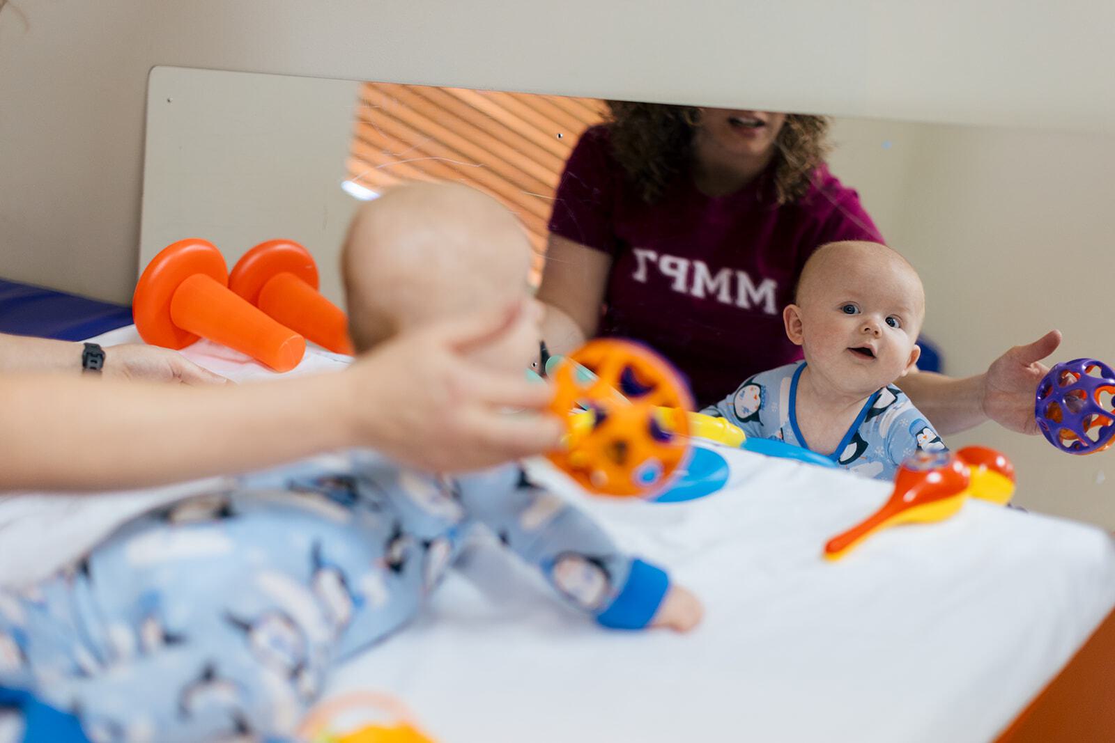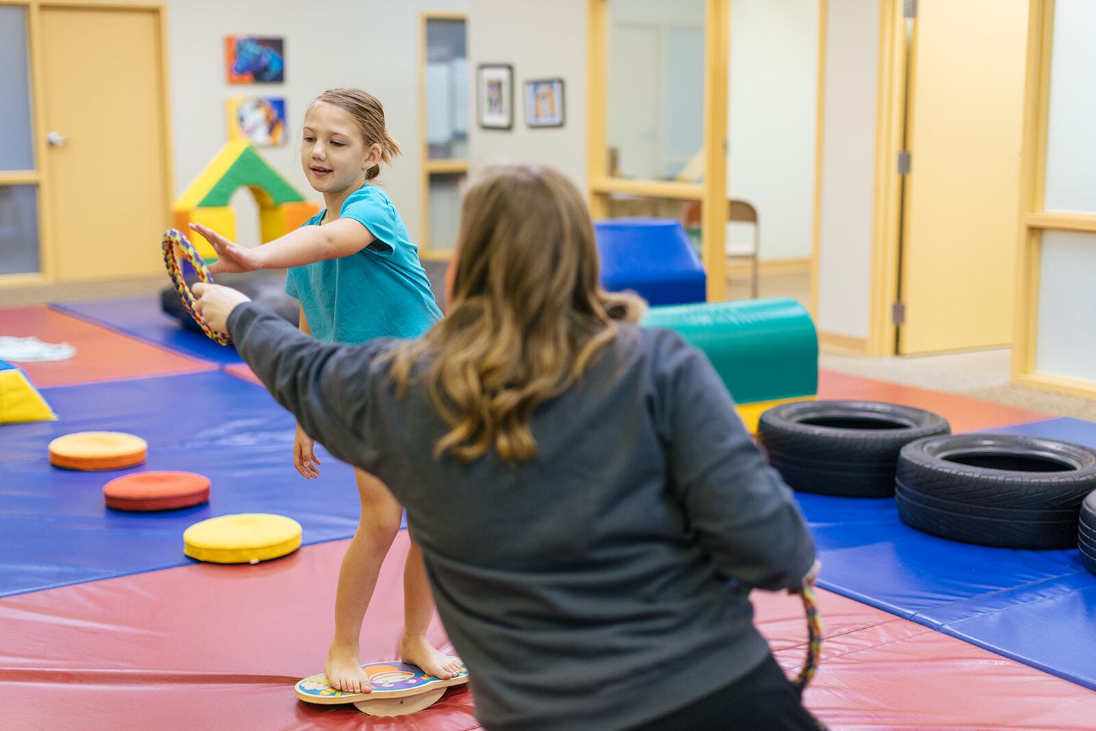 Physical Therapy utilizes specialized exercise equipment and tools like balance beams, small trampolines, therapy balls, hoops, and toys. This gym-style environment helps your child develop motor movement to improve their mobility in everyday life.